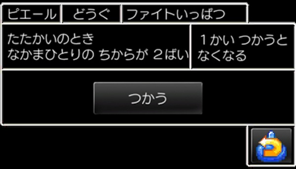 - 例)エビルアップル:ファイトいっぱつを味方に使う、ルカニ、攻撃