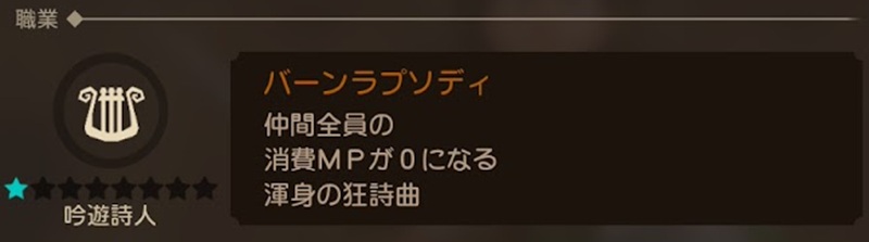 仲間全員の消費MPを0にするなんてどう考えても強いです。効果は各キャラ一回ですが、それでも十分に強いです。MP消費の激しい呪文アタッカーに関しては、この特性を使うためだけに吟遊詩人をかけもちに置いておいても良いと思います。