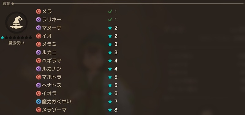 その名の通り呪文メインで戦うアタッカーです。マリベルの初期職である「ひよっこ網元」の上位互換のような呪文ラインナップとなっています。