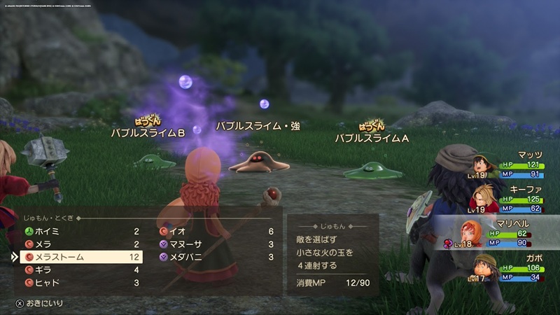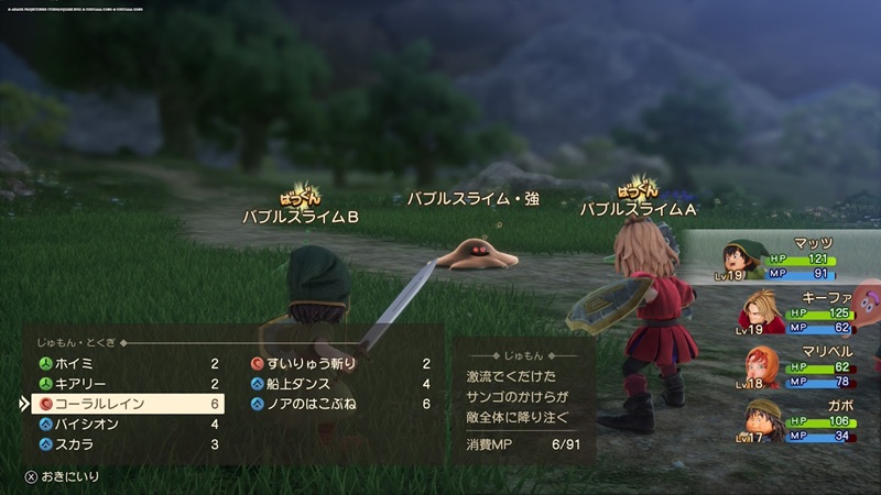 左右のバブルスライムには「コーラルレイン」が有効。「イオ」や「メラストーム」と組み合わせて一気に倒してしまいましょう。