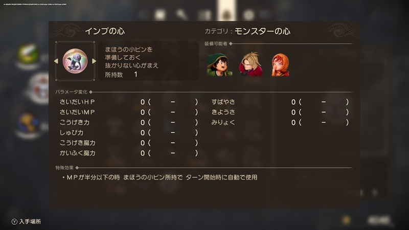 - 特殊効果:MPが半分以下の時、まほうの小ビン所持でターン開始時に自動で使用