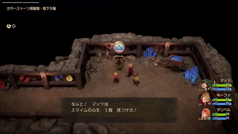 「スライムの心」は過去のウッドパルナ地方にあるカラーストーン採掘所の地下5階の宝箱に入っています。一番最初に向かうダンジョンで、少し謎解きはありますが特に問題なく獲得できると思います。