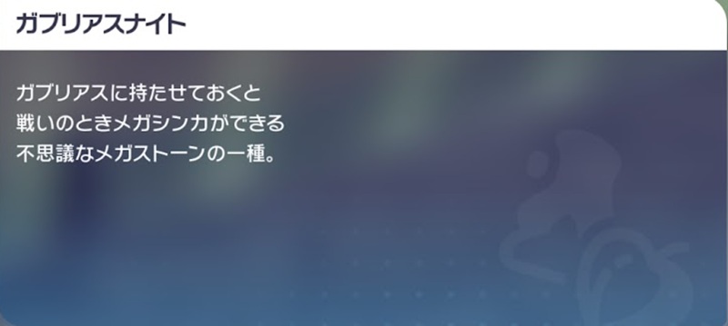 ガブリアスをメガガブリアスにするために必要な「ガブリアスナイト」は、ベール地区とブルー地区の間にあるプランタンアベニューの「いしや」に売っています。価格は70000円と結構高額なのでバトルゾーンなどでお金を稼いでおきましょう。