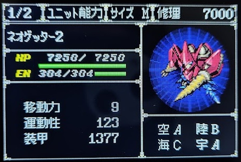 初期で移動力9、高い運動性、ネオゲッタービジョン(分身)、オープンゲット(特殊回避)、切り払い可能、ゲッター2号機には珍しい空適正、もちろん地中に潜るのも可能と、パッと見ただけでもとんでもない性能なのが分かります。