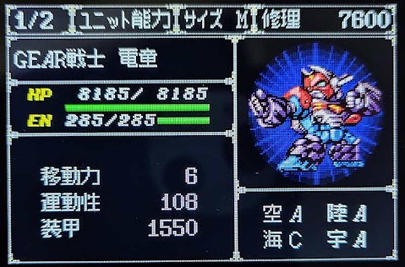 パイロットのドモンの格闘値がかなり高いので、高い運動性を活かしてどんどん敵に近づき格闘攻撃をお見舞いしていくのが主な運用方法です。気力が120以上になるとスーパーモードになりパイロットの能力と機体性能がアップするためさらに強くなります。