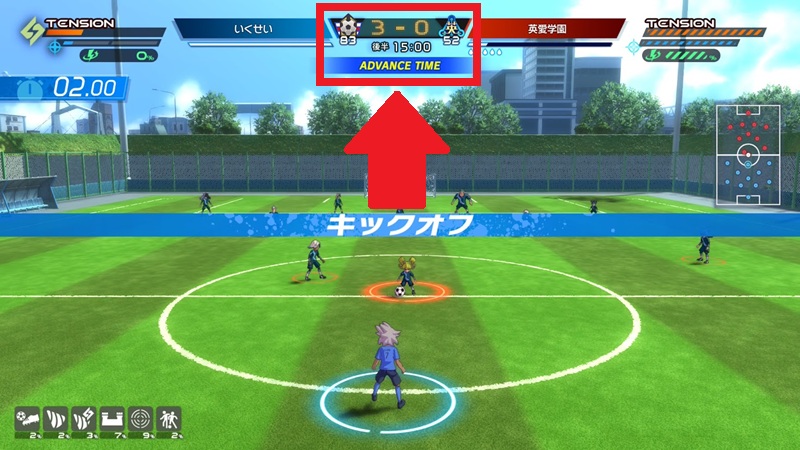 「アドバンスタイム」は前半で3点差をつけると、後半の時間が半分になるシステムです。アドバンスウィンを達成できなかった時の救済措置のようなもので、少しだけ試合時間の短縮が出来ます。