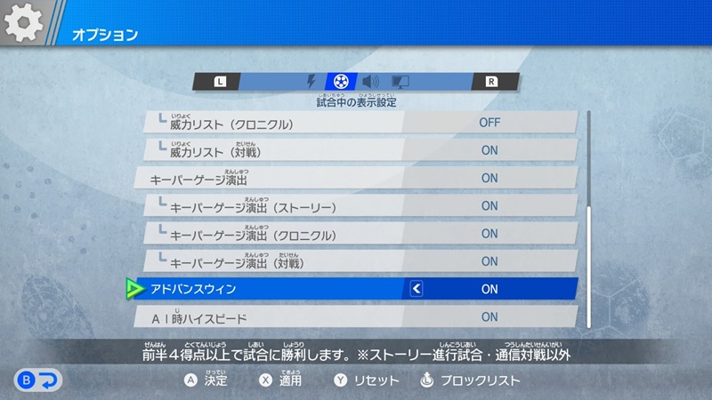 「アドバンスウィン」は前半で4得点すると、前半終了時にそのまま試合終了となるシステムです。格下相手など楽勝で勝てる状況で長々と試合をする必要が無くなるので、すごく助かります。