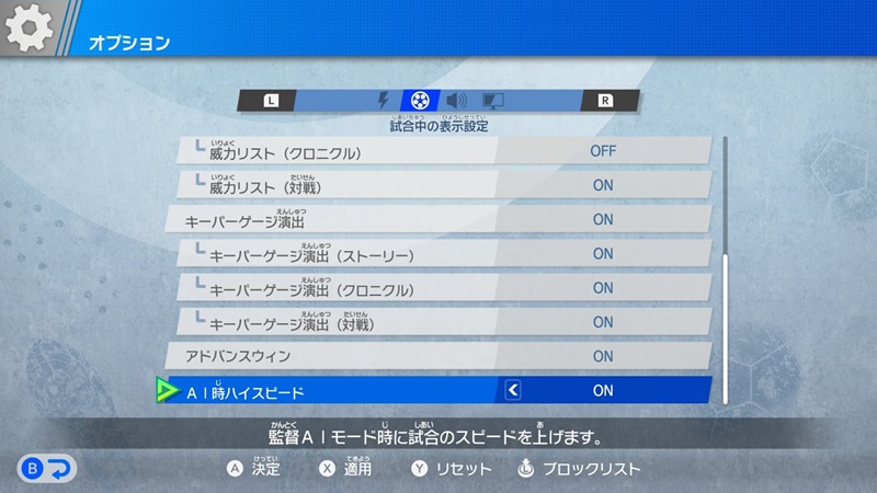 アップデートによりAI監督時の試合時間をハイスピードにすることが出来ます。と言ってもデフォルトでONになっているので普通に試合でAI監督モードに変更するだけでハイスピードに出来ます。