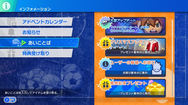 イナイレVにおいては、「あいことばの入力」と「特典の受け取り」の2段階操作が必要になるため少し手間ですが、両方やらないとアイテムは受け取れないので気を付けましょう!