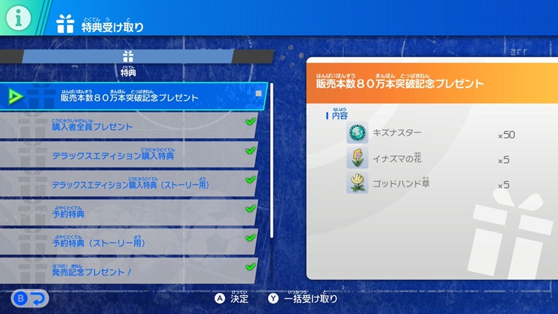 入力に成功したら、「特典受け取り」を選択。受け取る特典にチェックを入れて「決定」。