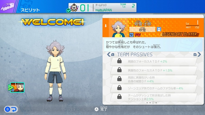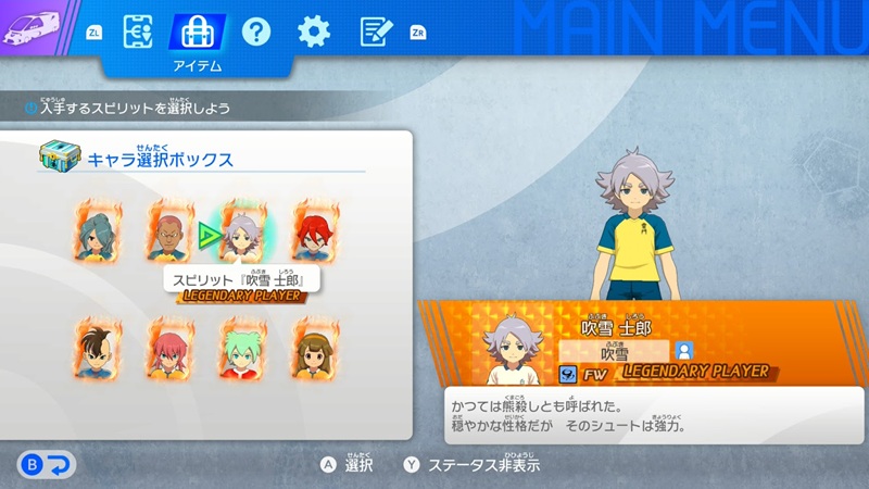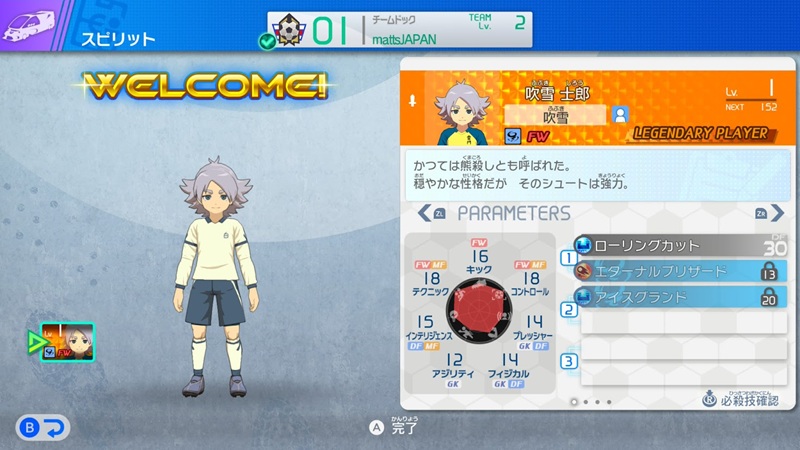 ちなみに筆者は悩んだ挙句に「吹雪士郎」を選択。他の選手の能力を見ることが出来なかったので、吹雪の能力を確認できる画像を置いておきますので参考にしてください。