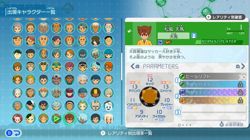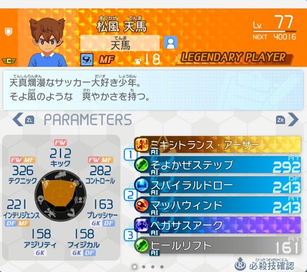 天馬は攻撃的にしても守備的にしても使いやすい万能型MFです。ノーマルドロップで入手した場合、最初からドリブル系の超次元技を2つ持っており、とてもキープ力が高い選手になっています。一方で、アビラーボードの空きが2つしかないため、「新たな可能性」を使わないとカスタマイズの幅が狭いという難点もあります。
