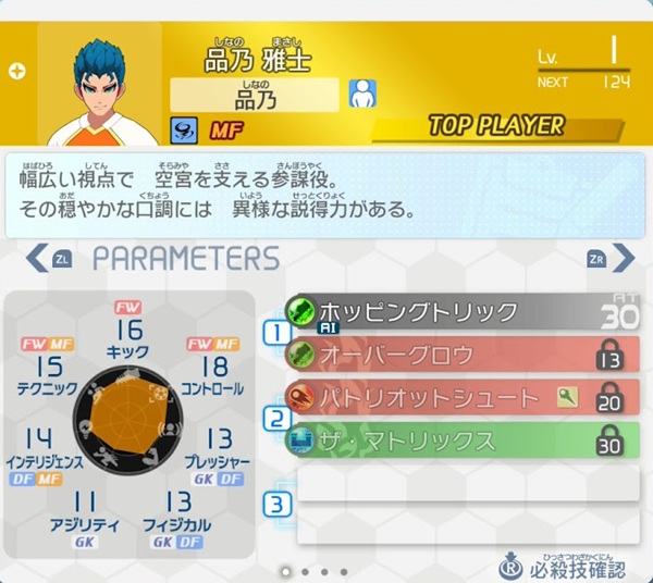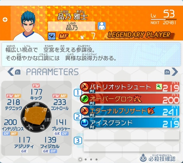 ロングシュート・ドリブル・ディフェンス技を自力習得するため、初期状態でもMFとして十分な技構成になっています。「パトリオットシュート」は北陽学園監督の下鶴改の得意技なので、品乃がそれを継いでいると考えると感慨深いものです。