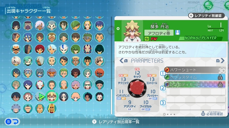アフロディ帝はその名の通りアフロディを崇拝しているので、育成もアフロディを意識してより近い技をメインで覚えさせました。現状ではまだレベルが低いですが、それでも十分に点を取れる爆発力を持ったFWなので将来性も抜群です。仲間にしたら是非育てましょう!