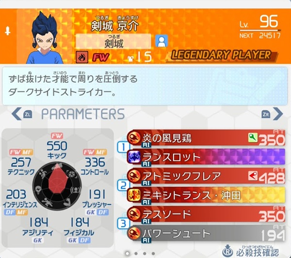 剣城のイメージ的には「デスドロップ」「デビルバースト」「ファイアトルネードDD」といった火属性の高威力シュートを覚えさせたいところですが、それだと余りにも使い勝手が悪かったので、今回はロングシュートとカウンターシュートといった多彩さを重視して技構成を考えました。技の内容も剣城のイメージから大きく外れるものではないかな?と思っています。