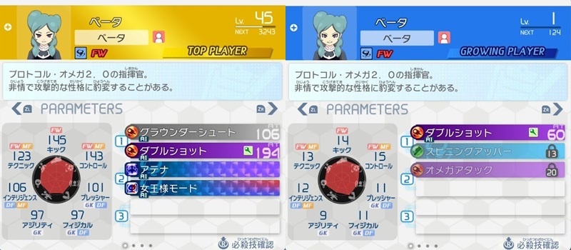 また、ベータには別バージョンがおり、最初から女王様モードのベータ(画像右)も仲間に出来ます。こちらは超次元技が無くなっている代わりにドリブル技とシュート技が追加されており、ロングシュートが一番上に設定されている影響でAI監督モード(オート)でかなり強いキャラとなっています。