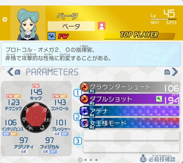 ベータは化身「虚空の女神アテナ」と「女王様モード」という2種類の超次元パワー技を持っているのが特徴です。圧倒的なパワーでフィールドを駆け回り、自身でもガンガン得点が取れる優秀なFWです。