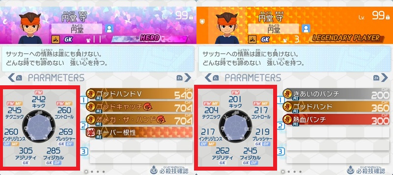 当たり前ですが、ステータス面では圧倒的にHEROの方が強いです。円堂守の場合、基本的にはGKとして使うはずなので、GKに必要なステータスが軒並み高いHEROが使いやすいです。装備品を整えるくらいでは全然追いつけないレベルの差になっているので、ステータス面では圧勝です。