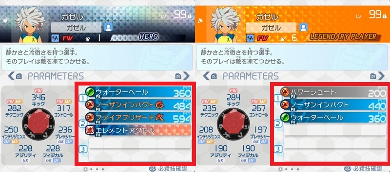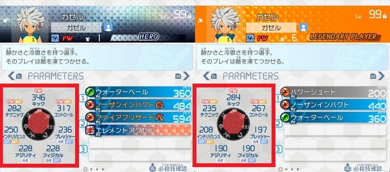 当たり前ですが、ステータス面では圧倒的にHEROの方が強いです。ガゼルはFWとして得点を常に狙いたいので、FWに必要なステータスが軒並み高いHEROの方が、フォーカスでの強さやシュートの威力などあらゆる面で優れています。