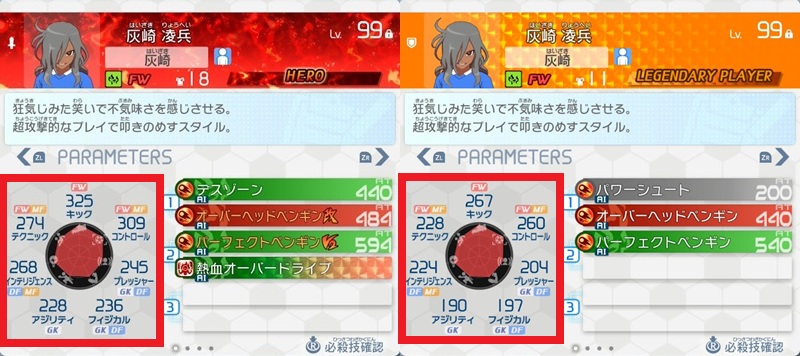 必殺技に関してはカスタマイズすることでFWとして使いやすくなるLEGENDARYの方が若干強いです。と言うより、HEROはシュート技オンリーで正直使い辛いです。