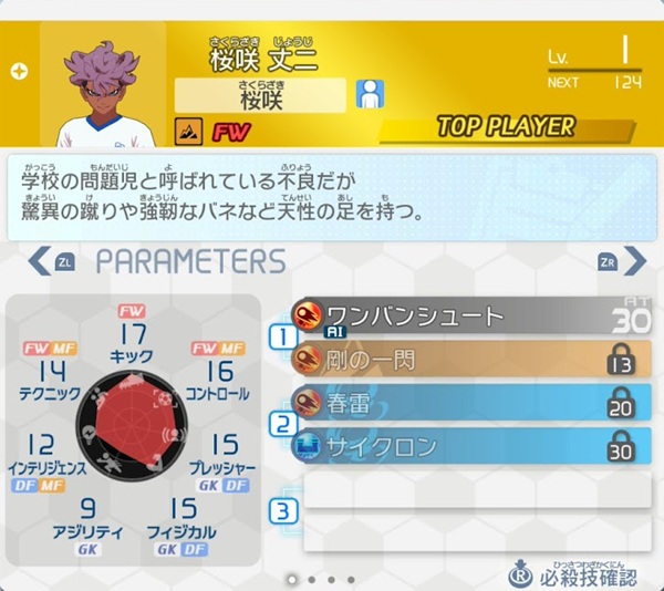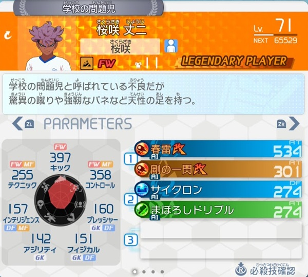 必殺技に関しては2属性のシュート技を使いこなし、ディフェンス技も覚えるので前線でボールを奪ってそのままシュートも狙えます。特に春雷(ストーリーモードではイベント習得)の威力がかなり高いので、基本的には春雷を優先して使うとゴール数が増えやすいです。