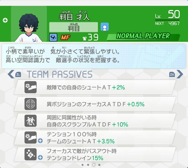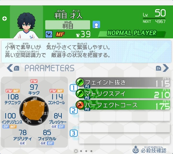 実際に使ってみての評価としては、攻撃的MFとして及第点ですが、ライバルが多いポジションなので生き残りが大変です。MF型のセレクトキャラ全員に言えることですが、攻撃的MF枠はライバルが多く、最終的なメンバーに生き残れるかはプレイヤーの愛次第な所があります。