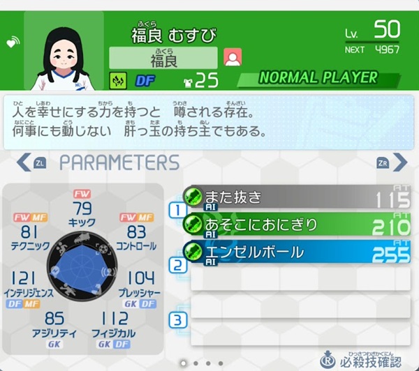 実際に使ってみての評価としては、謎のドリブル技3つを上手く使いこなせずかなり使いにくいキャラです。ステータスの数値はその他のDFキャラと同等で、DFなのにディフェンス技を覚えないとあれば使い勝手が悪いとしか言いようがないです。