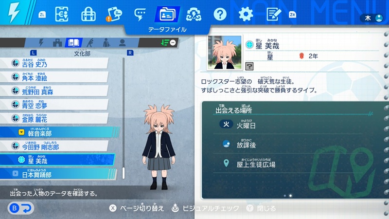 クリア後のスカウトは他のキャラと違って話しかけるだけで勧誘出来ます。火曜日の放課後限定で南雲原中の屋上生徒広場に出現します。