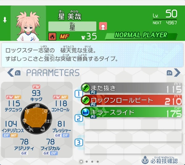 能力的に前目のMFとして使いたいのでレベル38のアビラーボードでシュート技を覚えさせるまでは物足りないです。また、ディフェンス技の「キラースライド」はファウルを取られやすいので、あまり後ろのポジションで使うと思わぬピンチを招くことになるかもしれません。