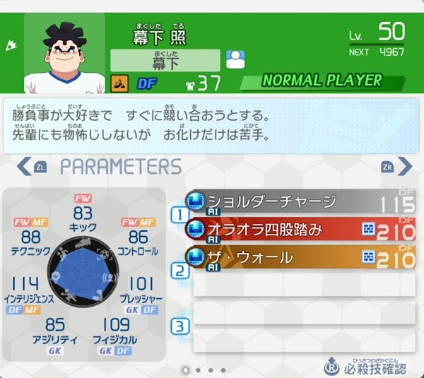THEセンターバックという隙のない技構成。2種類のシュートブロック技を持つためロングシュートにも対応できます。アビラーボードでドリブル技を覚えさせておくと更に使い勝手が増します。