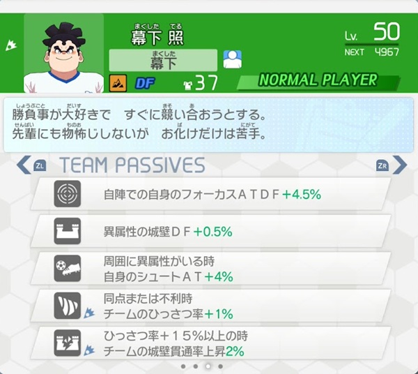 - 周囲に異属性がいる時、自身のシュートATアップ