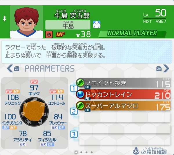 早い段階でディフェンス技を覚えるため、最初は不足しがちなDFを任せられるのが嬉しいです。アビラーボードのルート切り替えによってディフェンス型にもシュート型にも出来るため、チームの状況で立ち位置を変えられます。