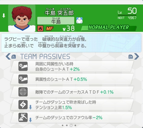 実際に使ってみての評価としては、猪突猛進の脳筋キャラかと思いきやプレイは変幻自在で、見た目とサッカーの内容が全然違う使いやすいキャラです。こう見えてステータス的にもフィジカルよりインテリジェンスが高いのは何故か笑えてきます。(ごめんなさい)