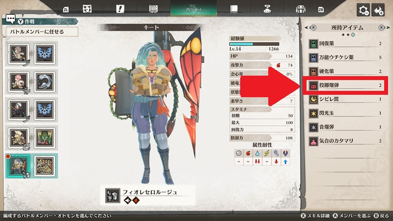そこで実はアイテムを一切使わずに簡単に倒す方法があります。それは、挑む直前にバトルメンバーを「キート」に変更することです。キートは所持アイテムに「投擲爆弾」が入っており、この爆弾を使うことで簡単に倒すことが出来ます。