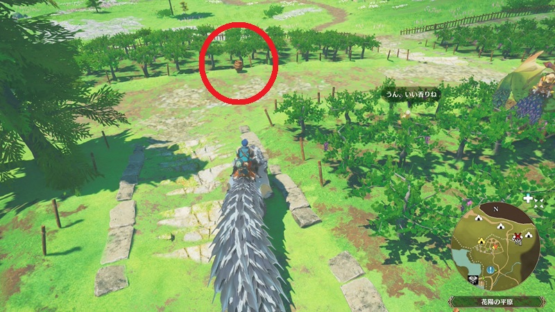 タルアイルーに最序盤で出会うにはアズラル領域に出てすぐの所にある果樹園のような所が最適です。出現率が低いので、画像の場所に行ってみて、周辺にいなければファストトラベルで城に戻るのを何度も繰り返しましょう。