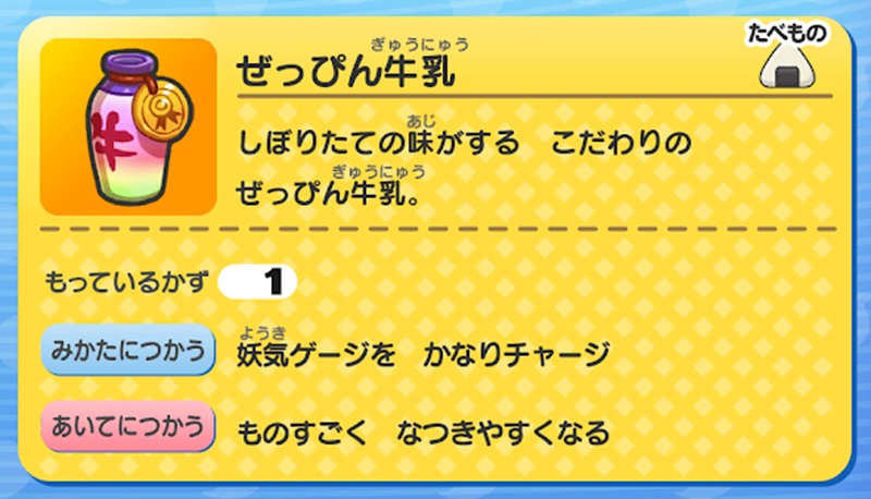 ショップで買う以外に、妖怪ガシャの景品で出たりたのみごとの報酬になっていたりと、様々な方法で入手できます。上記の食べ物はいざという時に使いたいので、無駄遣いせずにとっておきましょう。