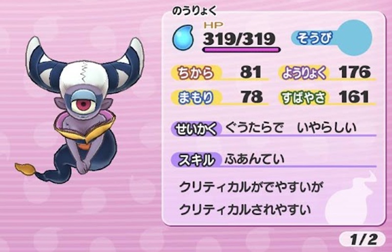 ようじゅつとすばやさの伸びがかなり良く、吹雪の術でどんどんダメージを与えていける妖術アタッカーです。とりつきの効果が全ステータスダウンなのでお邪魔系として使うのもアリですが、高い妖力を活かした氷アタッカーとして活躍させるのが良いと思います。