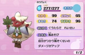 ようじゅつが圧倒的に高く、その他のステータスも高水準でスキル効果もかなり強いという、最強クラスの妖術アタッカーです。攻撃、妖術、必殺技の全ての威力が高く、スキルの「きゅうかく」の効果で攻撃が必ず命中するため、万能アタッカーとしても活躍できます。