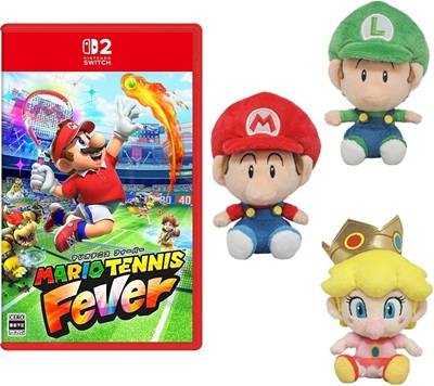 Switch2ソフト「マリオテニス フィーバー」と、細部までこだわったふわふわな手触りのベビィマリオ(S)・ベビィルイージ(S)・ベビィピーチ(S)のぬいぐるみがセットになった商品です。